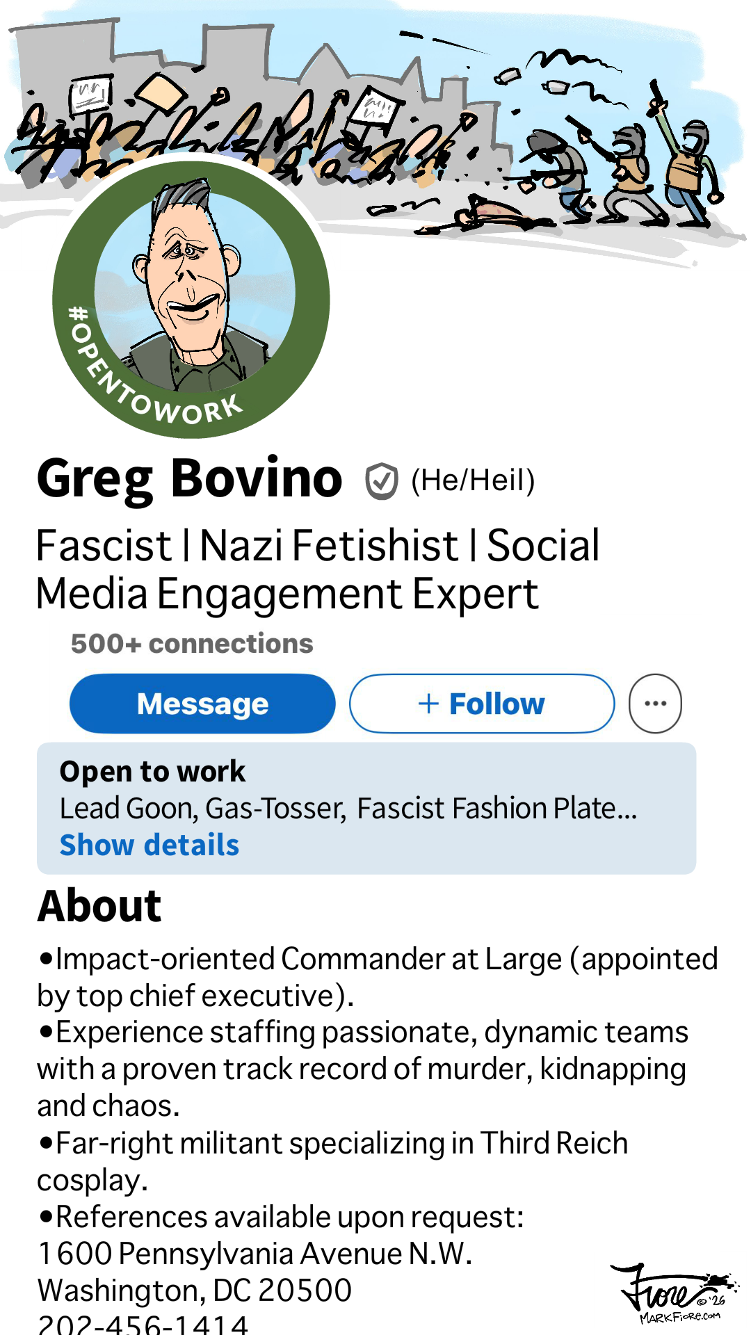 In the meantime, I figure that Bovino is hard at work today on his LinkedIn profile, so I thought I’d give him some help…